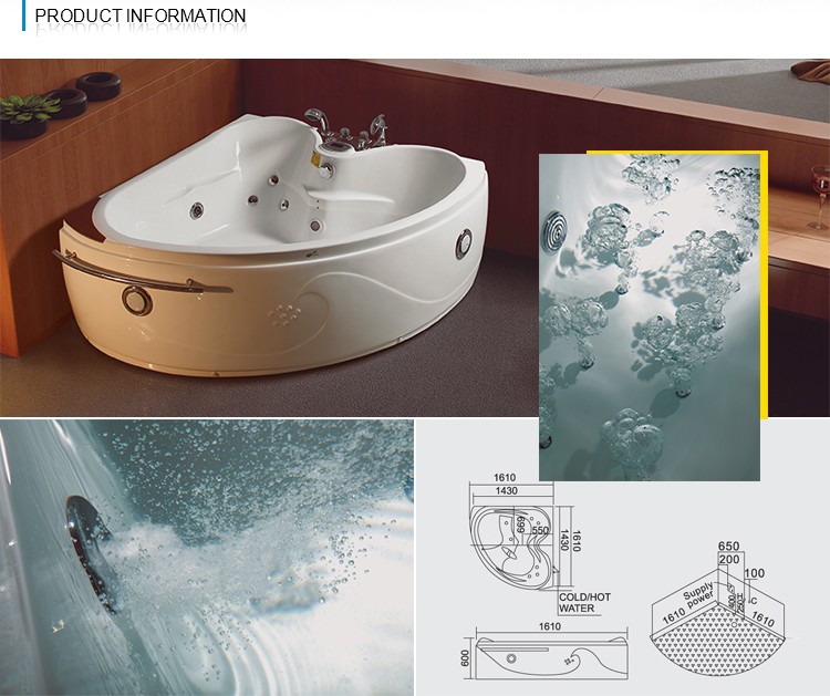 Type Corner Product Code SWTAIBTMY1553W Brand TAIHE Warranty 1 year on motor Dimension 1610 x 1610 x 600mm Specifications Hand Shower Dolphin bath filler 8 small massage jets 5 big massage jets 2 small headrests -
